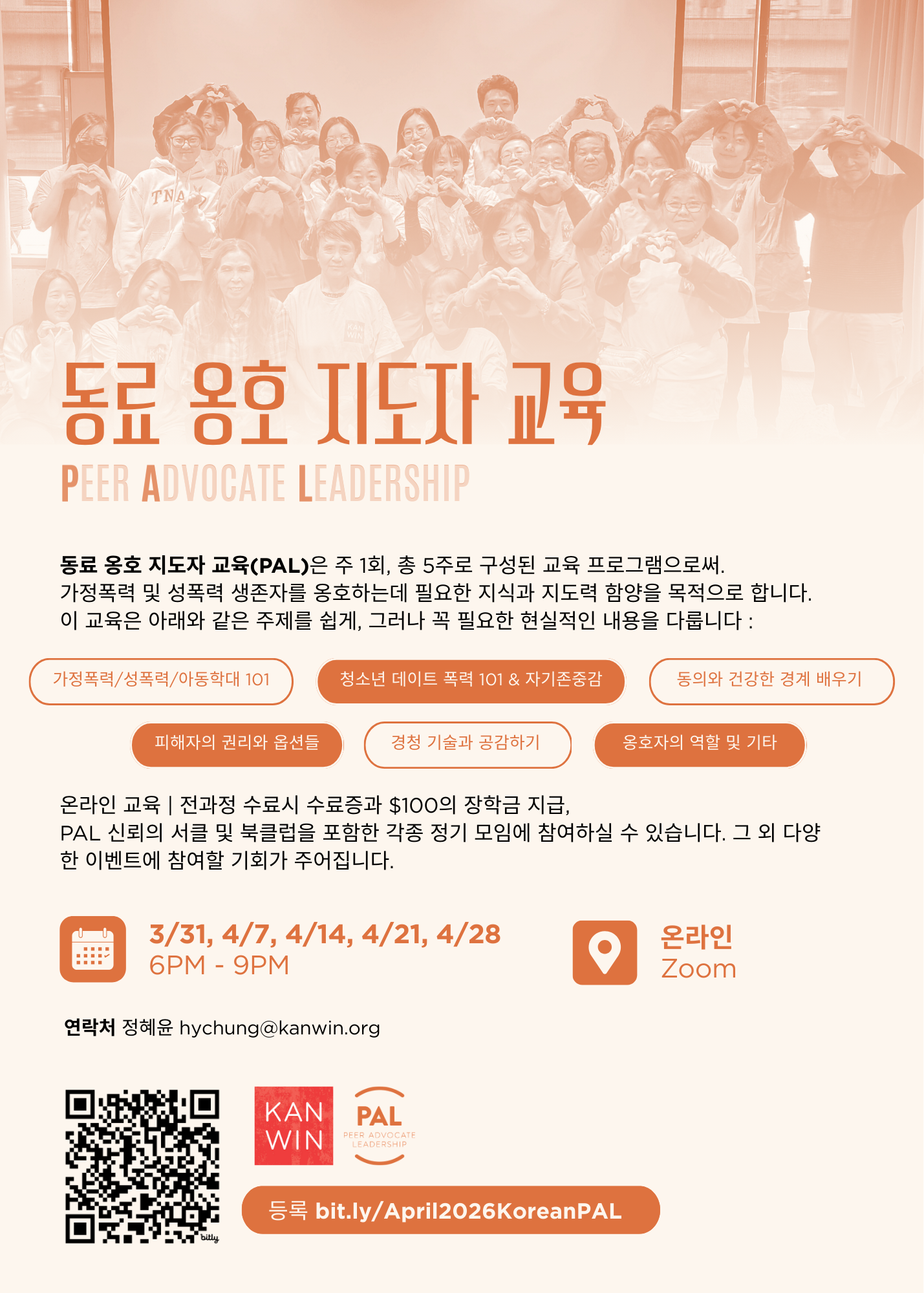 동료 옹호 지도자 교육 (Peer Advocate Leadership, 이하 PAL) 프로그램은 KAN-WIN의 가정폭력 및 성폭력 근절을 향한 풀뿌리 리더십 교육입니다. 이 교육을 통해 PAL 참가자들은 가정폭력 및 성폭력 생존자를 옹호할 수 있는 도구와 지식 (가정 폭력 101 , 성폭력 101, 가정폭력이 자녀에게 미치는 영향과 아동 폭력, 청소년 데이트 폭력 101, 피해자의 법적 권리 및 옵션들, 건강한 관계와 바운더리 지키기, 경청 및 공감 기술 등)을 취득하게 됩니다. 또한, 교육 과정을 통해 배운 지식과 정보를 문화적/언어적 상황을 배려한 방식으로 지역사회에 전달하고, 한인 커뮤니티를 안전한 공간으로 만드는 운동에 앞장서게 될 것입니다.